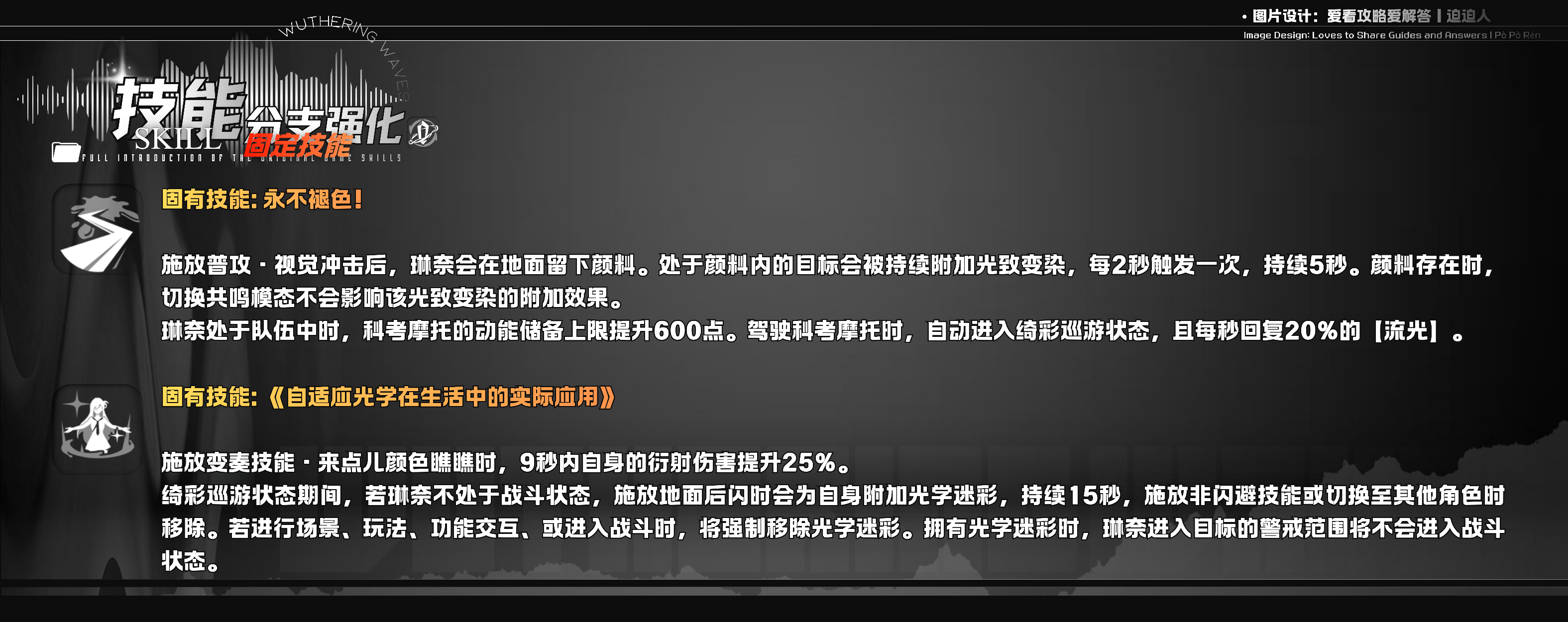 ■关于琳奈的核心战斗优势(增伤覆盖全、持续久)琳奈施放普攻的视觉冲击时消耗3点【本色】使全队队员的谐度破坏增幅提升40点,持续30秒(而琳奈之所以适配副C的原因,她自身每点的谐度破坏增幅还会使自身对该目标造成的最终伤害提升0.12%)。在施放大招时可令全队造成的伤害提升24%,同样持续30秒超长的buff加成时间,延奏技能可令下一个登场的角色全伤害加深15%,共鸣解放伤害加深25%;且自身普攻频率高,输出循环流畅,并列爆发与持续输出的最佳状态,低成本就可以玩。