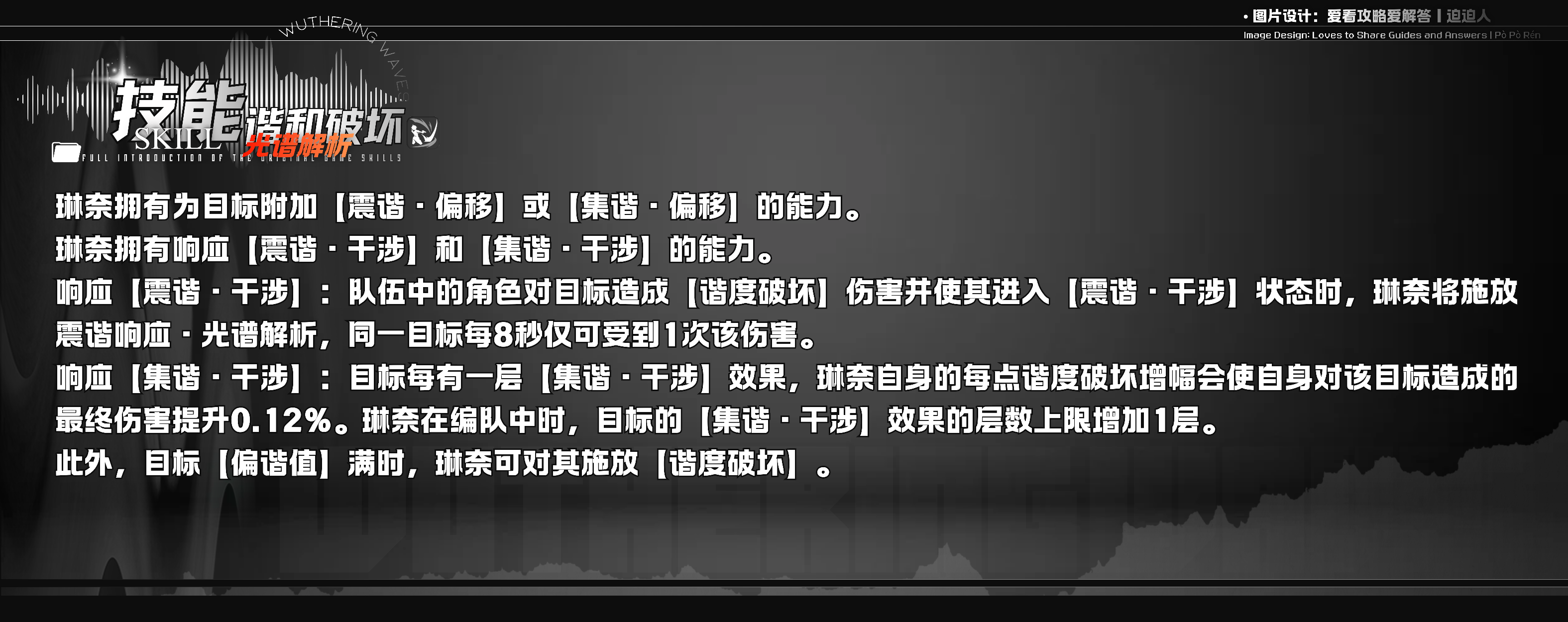 ■关于琳奈共鸣回路下的两种模态共鸣模态·震谐:队友造成谐度破坏后,琳奈可触发【光谱解析】(琳奈对范围内处于【震谐·干涉】状态的目标造成衍射伤害)打出爆发伤害,追求瞬间秒怪 共鸣模态·集谐:持续增伤,适合长轴驻场持续输出。