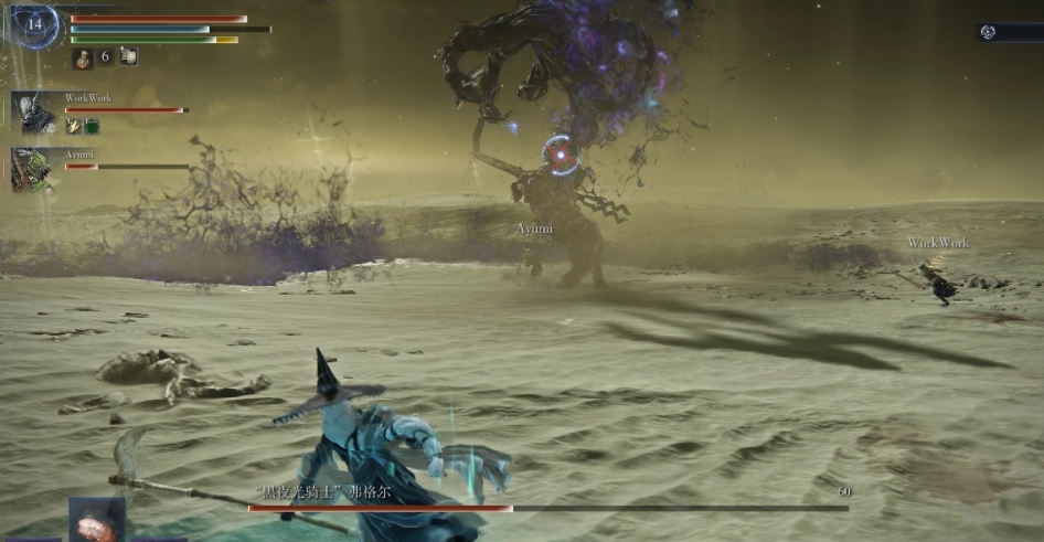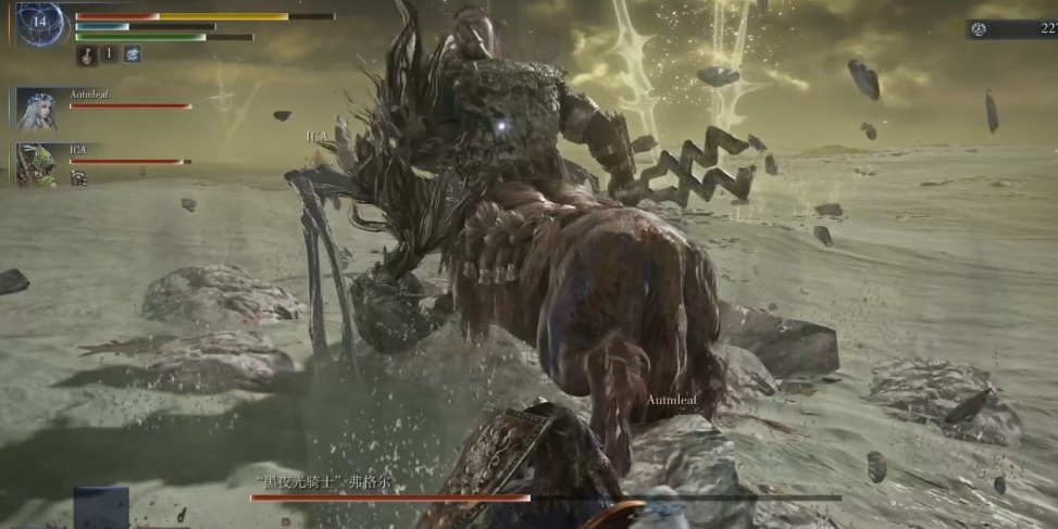 第二个新增招式是它会扫地面产生沙尘暴,跟一阶段一样听声音向前翻滚即可。半人马在血量低于百分之六十时会开启第三阶段,此时它会多出来一只手,而且天空会变成金黄色,此时新增招式是它会向前挥击三次。还有一个招式是它会原地踏步几下,随后开始不断向前冲刺,第一下时它不会冲向玩家,往旁边跑开就可以,之后跟着跑看到它回头立刻向右翻滚。