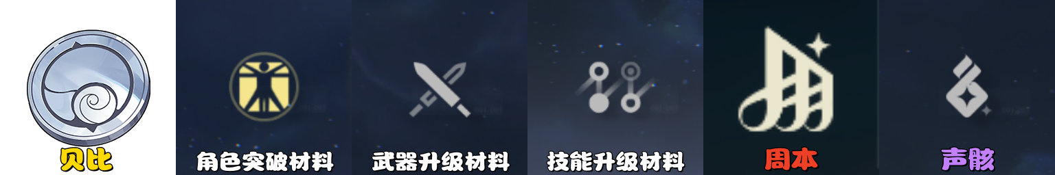 贝币 > 角色突破材料 > 武器升级材料 > 技能升级材料 > 周本 > 声骸