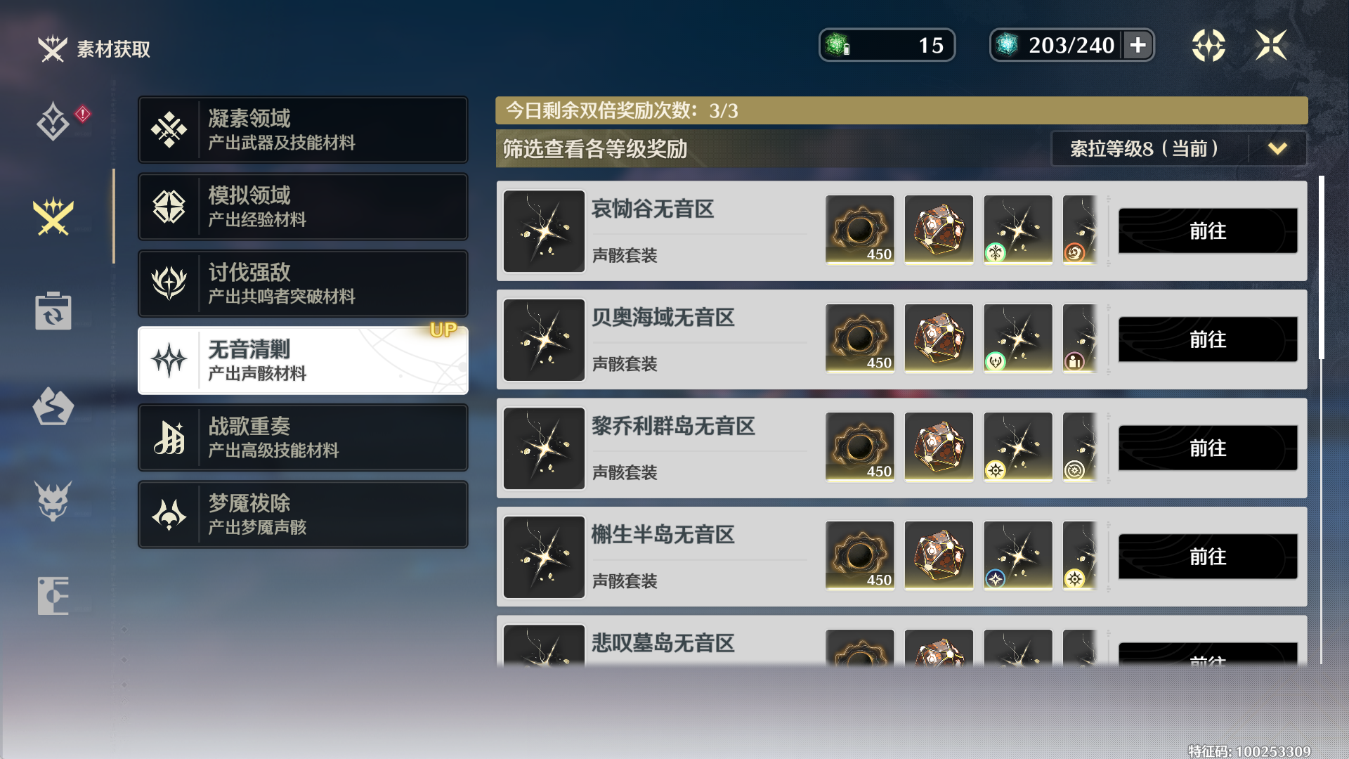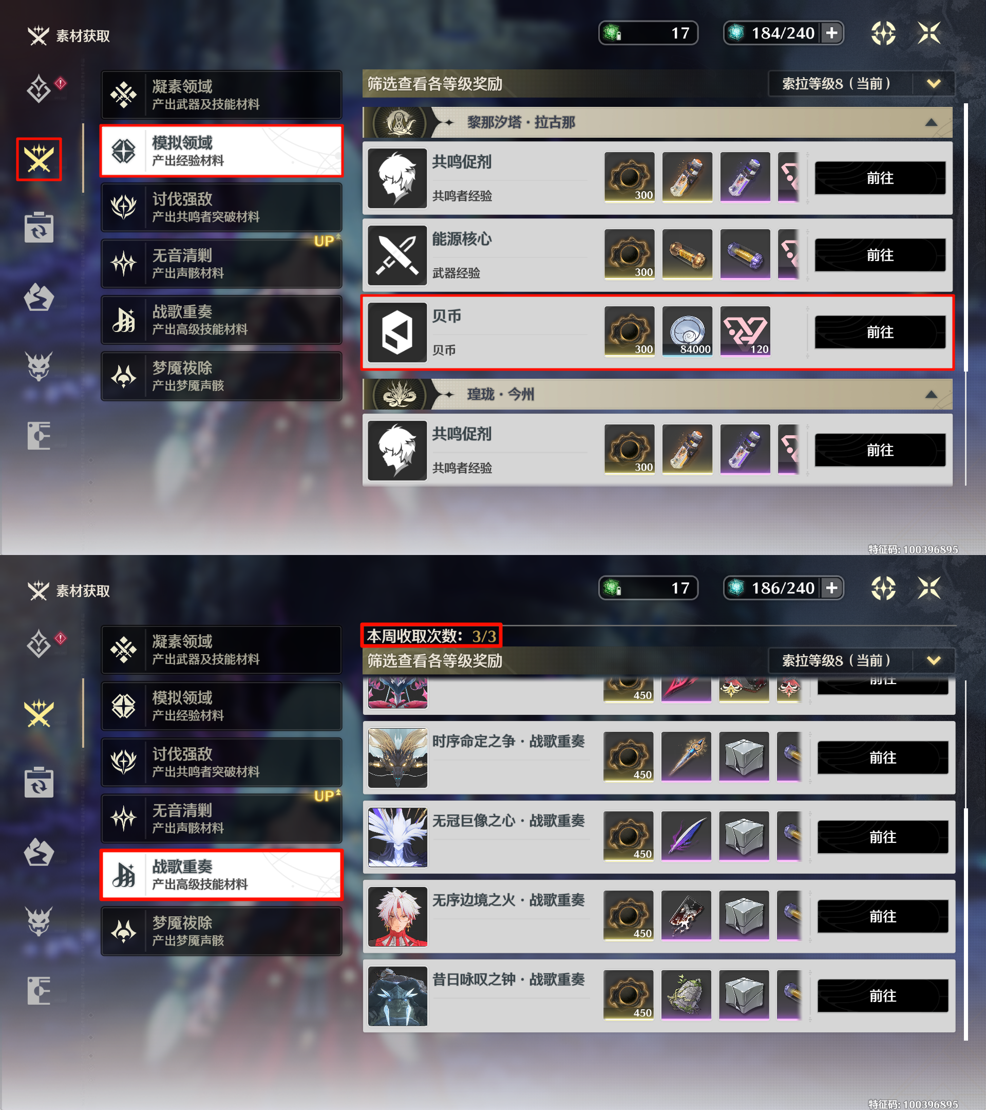 ④消耗结晶波片(体力)刷副本:凝素领域、模拟领域、无音清剿、讨伐强敌、战歌重奏;