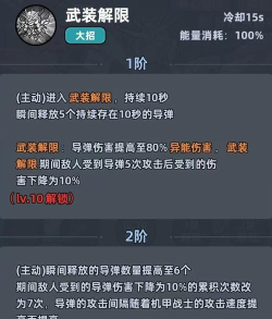大招释放之后进入武装解限状态,瞬间可释放5个持续存在的导弹,在武装解限状态下,导弹的伤害提升。也正是因为这样的特点,所以他在前期开荒和中期过渡过程中非常强势,只不过在后期输出略有乏力,不过可以作为前期主C,后期转换成副C,这样根本不会浪费。在使用的时候应该优先提升攻击属性,接下来才是最终增伤、追击率和暴击以及攻速。主要都是围绕着提升脱手伤害和破防去堆。培养过的时候优先升到三星,可以解锁额外的追击加成,使得清场的效率变得更高。因为这个角色最强的能力就是在于清场快,适合中期过度,是很多微氪玩家开荒的首选。