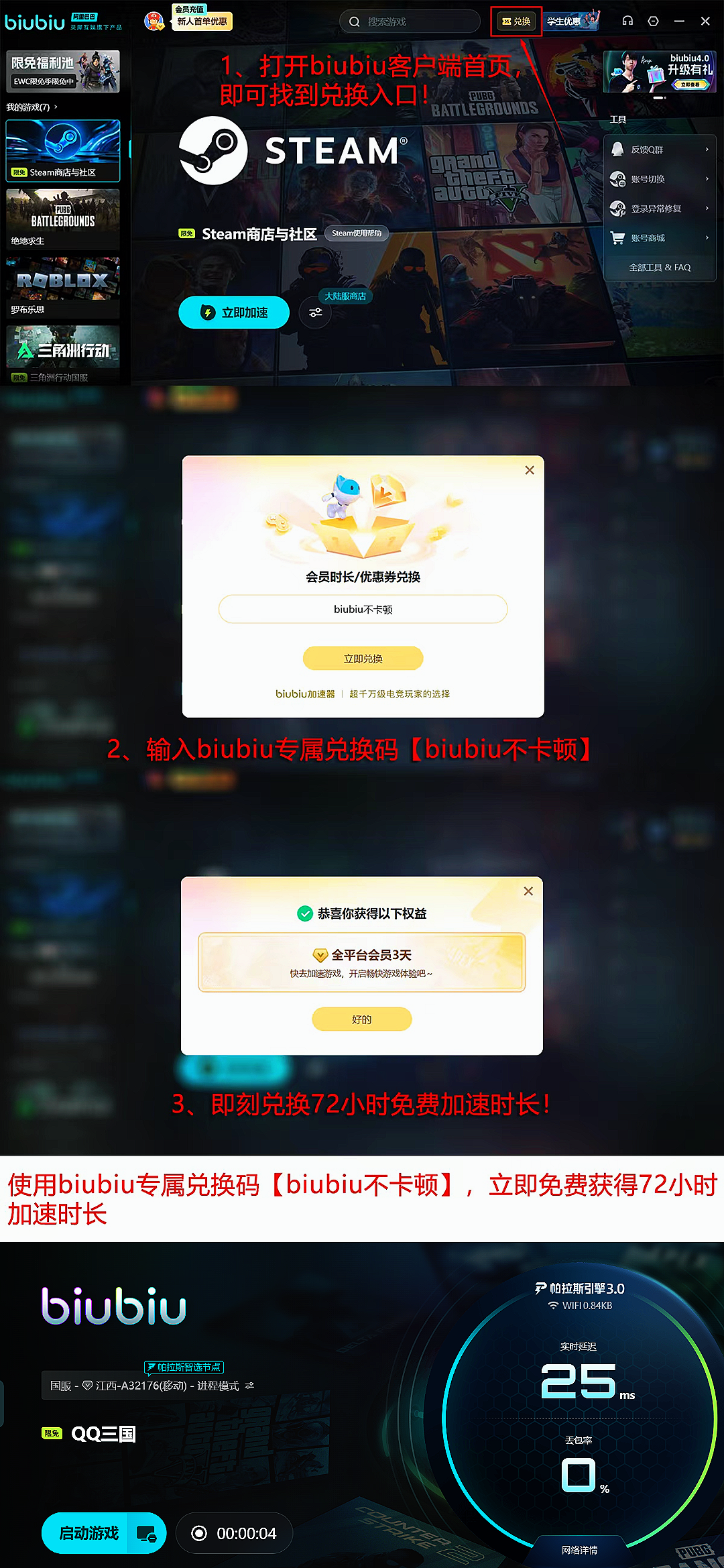 为帮助更多玩家直观感受产品实力,biubiu面向新注册用户开放24小时全游戏免费加速权益,覆盖《QQ三国》及其他主流网络游戏;同时,输入专属兑换码【biubiu不卡顿】,即可额外领取3天加速时长,累计达96小时。服务节点分布广泛,线路智能优选,兼顾新手引导与长期用户权益延续。