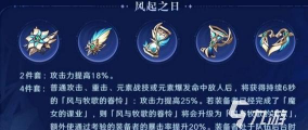 另一个“风起”套则是偏重提升基础攻击和持续作战能力,二件套简单直接提升了角色攻击力,四件套则是需要命中敌人触发,获得1个持续6秒的攻击力up效果。如果装备的角色完成了魔女的课业,那么效果还会继续升级,额外加暴击。适合温蒂、可莉、杜林、菲谢尔。