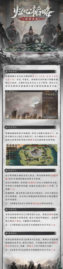 群雄逐鹿按阶段开放城池,阵营之间默认彼此对立,各阵营拥有自己的【占领积分】,攻占城池可以获得积分,最终会依照各阵营积分的排名决定最终胜负和奖励。
