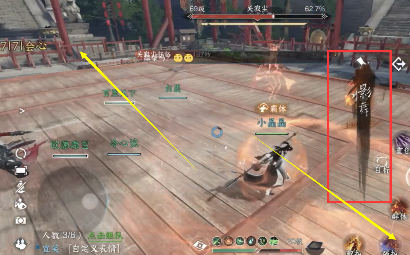 3.关寂尘释放影舞的时候,铁衣素问不动,输出提前往平台的左右分散,提前蹲好斩灵的位置,输出分为2队每队2个去击败斩灵!