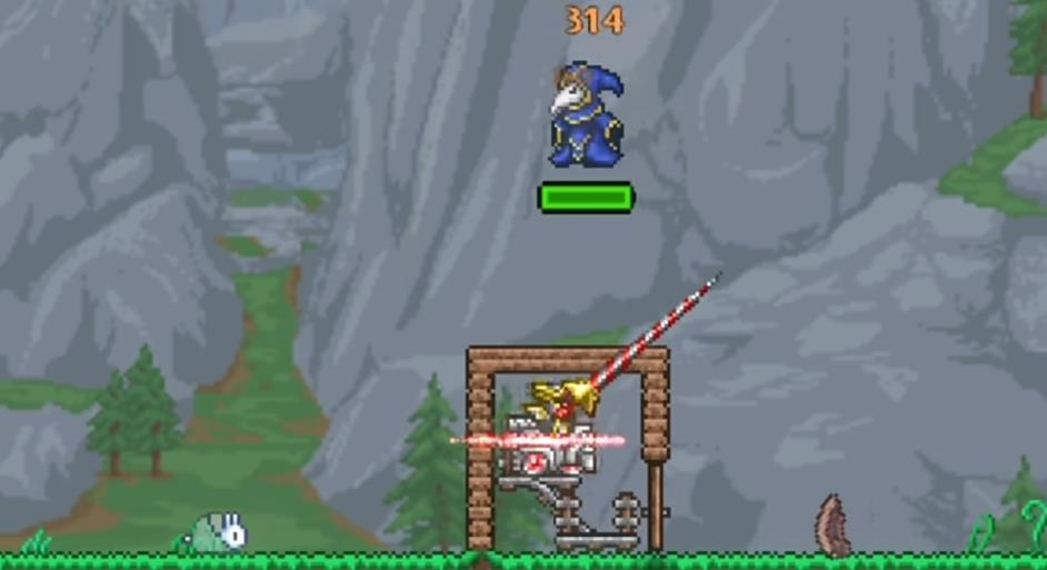 骑枪看起来普通,但是有个特性是玩家移动速度越高,伤害越高,可以利用铁轨的反弹特性将自身移速大幅提高。最低都能打出几千多的秒伤,但是骑枪的攻击距离不够长,根本就无法轻易的打中教徒。可以将铁轨重叠摆放上下两层,只需要先斜向放置三根铁轨,在其两侧末端的一左一右,再横向放置一根铁轨。用锤子将上下两层铁轨的末端,每个都敲击两下,这样就会让铁轨有了反弹的效果。