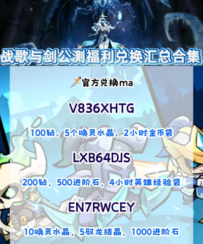 战歌与剑将在1月16日开启不删档内测,手游测试或者上线经常会给到许多礼包兑换码,战歌与剑也是如此。那么战歌与剑兑换码有哪些呢?这里就给大家都罗列出来,这样大家就不用到处找到了。此外,大家如果喜欢玩这个游戏的话就可以去九游app下载,它是阿里巴巴灵犀互娱旗下品牌,九游是手游福利最多最全的平台。