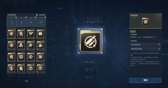 点击插件位1、2、3、4,系统自动识别对应插件,双击即可装配或替换,不需要自己查看是几号插件。插件左下角的圆形三角是限定武器标志,意味着该插件仅某种类型武器可装备。插件右下角的数字为该插件数量,并非插件位置。
