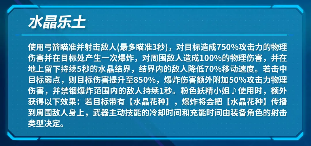 往世的飞花•爱之诗(往世的飞花)是一把物理输出型弓箭,主动可以瞄准并射击敌人造成物理伤害并附带爆炸伤害;此外,在爱莉使用时还能传播【水晶花种】。被动1提供了可观的物伤、爆伤加成,被动2(往世的飞花没有)则进一步提高了爱莉的输出,目前看来,可以说是爱莉的专属加成,对其余弓箭角色(皇女)基本没有收益。