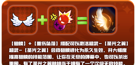 【翅膀】+【重伤坠落】搭配可以激活超武-【圣光之翼】,超武-【圣光之翼】会将翅膀进化为永久生效,并大幅度提高翅膀的技能范围,让你在无尽的弹幕中,也可以杀出重围。有了圣光之翼就相当于拥有了一个次级无敌技能。