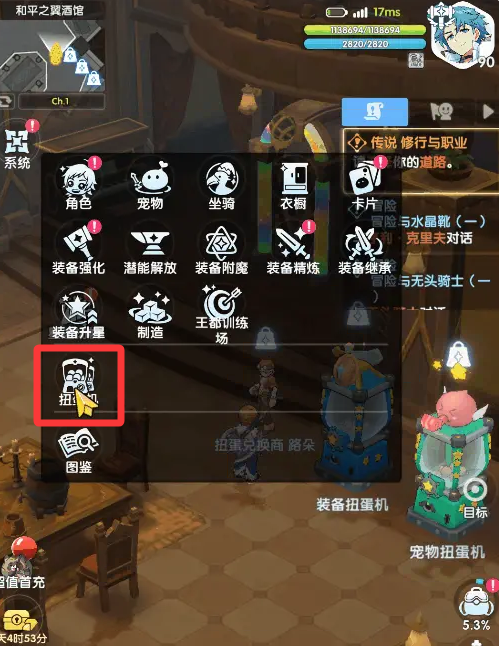 2、装备扭蛋机:可以获得对应等级的彩装或紫装、Boss卡片、潜能释放的材料、扭蛋兑换券等。