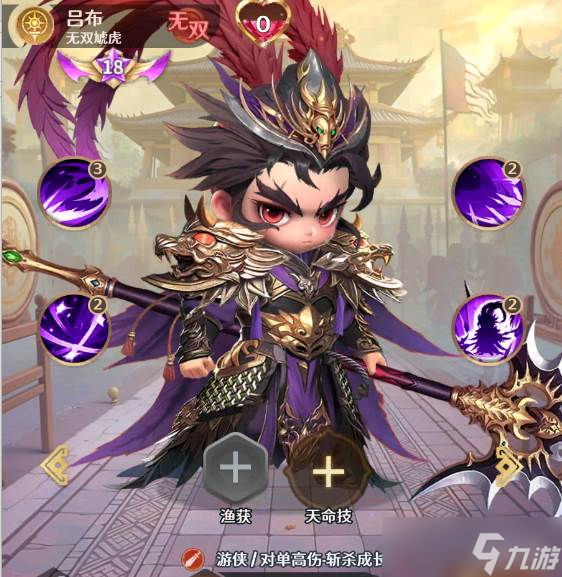 无双·吕布:具备群攻爆发与克制敌方回血和复活技能,单体超高伤害,速度极快,1号出手位。