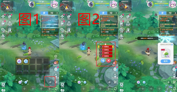如下图1红框所示"+"号,点击后将宠物球放入快捷栏;