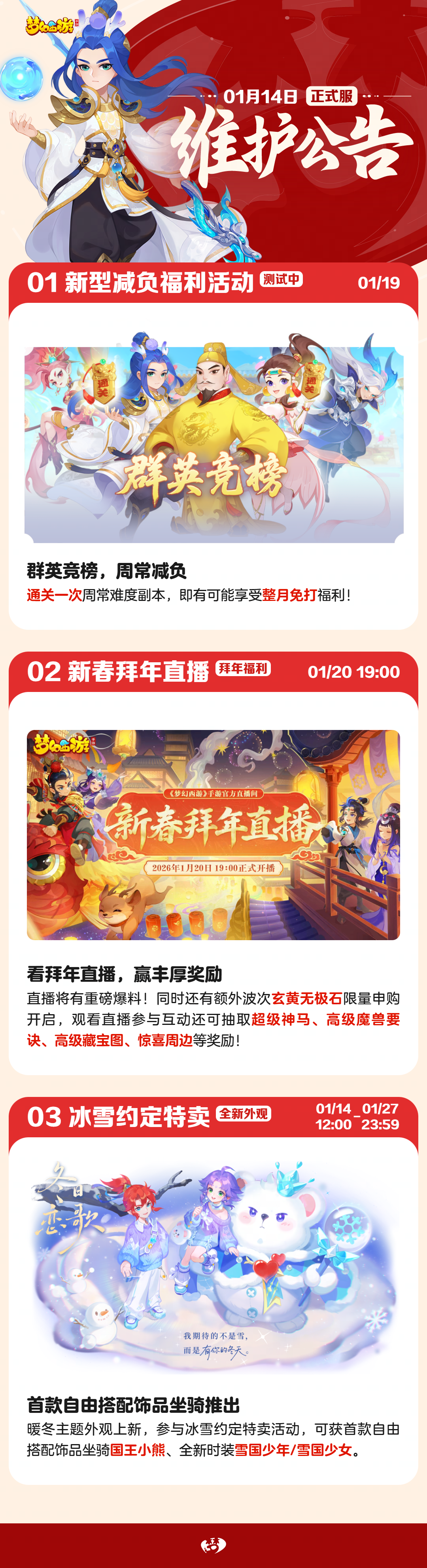 一年一度的拜年福利“新春拜年直播”将于2026年1月20日19:00开启。届时,开发组将带来年度回顾、全新典藏外观、最新开发内容等重磅爆料!同时还有额外波次玄黄无极石限量申购开启,观看直播参与互动还可抽取超级神马、高级魔兽要诀、高级藏宝图、惊喜周边等奖励,中奖率超高,不要错过哦~