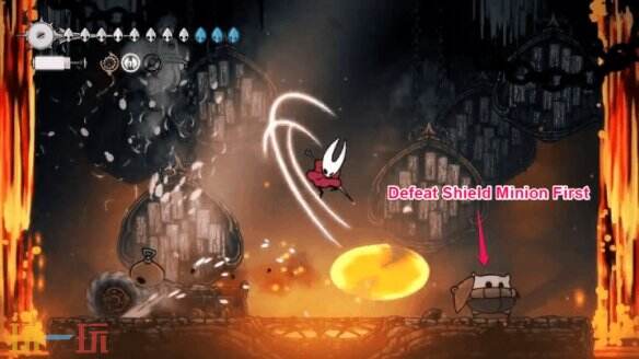 优先处理持盾小怪!否则战场遭包围后将难以周旋。注意顶部周期性坠落的熔岩,通过观察天花板熔岩积聚可预判落点。