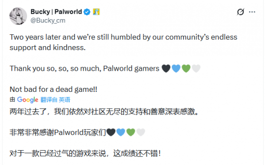 针对最近部分玩家将《幻兽帕鲁》玩家数量下降视作游戏已死”的观点,《幻兽帕鲁》的传播总监兼设计师?John 'Bucky' Buckley?在社交媒体上作出了回应:两年过去了,我们仍然对社区无尽的支持与善意感到受宠若惊,非常非常感谢《幻兽帕鲁》玩家们,这对于一个‘已死’的游戏来说还不赖!!”