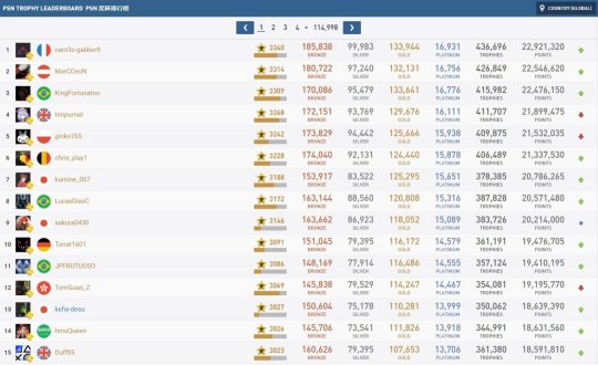 根据知名玩家数据追踪网站PSNProfiles的统计,在网站注册用户范围内,全球仅有约52名玩家的白金奖杯数量突破了一万大关。其中,目前白金奖杯数的纪录保持者是ID为caro3c-gabber9”的玩家,其白金奖杯数高达16,915个,总奖杯数更是达到了惊人的436,306个。数据显示,目前白金奖杯数超过1万6千个的玩家,全球仅有4人。