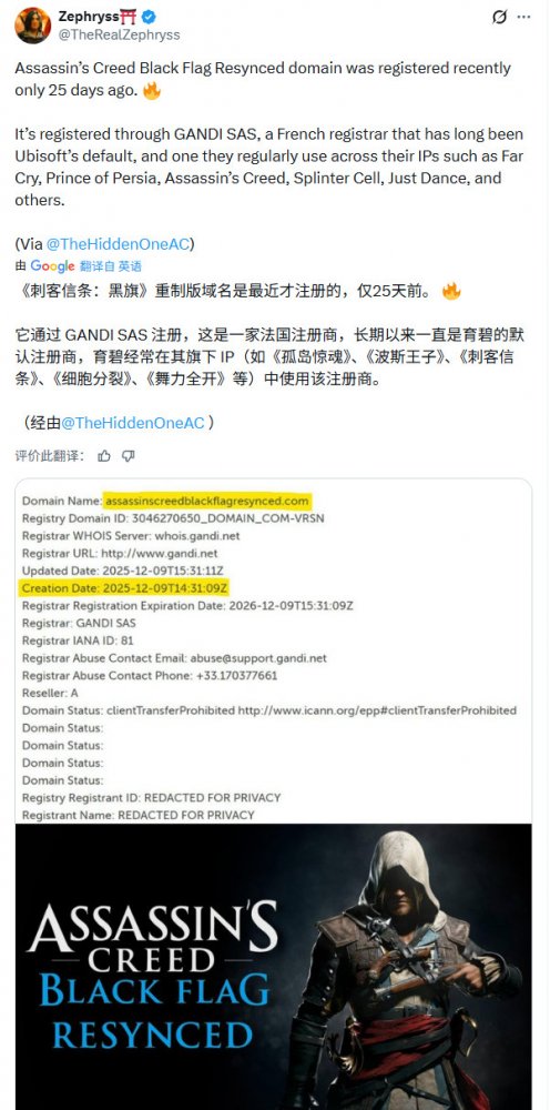 另外,有国外玩家发现育碧最近才注册了《刺客信条4:黑旗》重制版的域名: