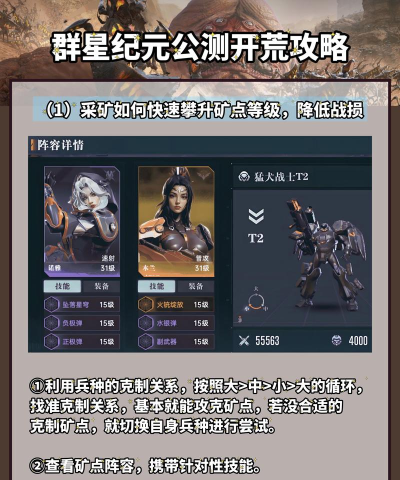 培养英雄方面别一味的追求高级,有些低阶英雄机制是特别好用,搭配防御型器件和合适的装备,前期能够完整的过度,等资源充足再换高级英雄,在战斗的时候站位真的很关键,别把所有单位都堆在一起,不然对方一个群体技能就能团灭,打区域boss这种特殊目标就要先摸清对方的技能和反伤规则,稳扎稳打才能少损失兵力,采矿之前一定要侦查,选自己能克制的点位去采,实在打不过就叫队友帮忙。