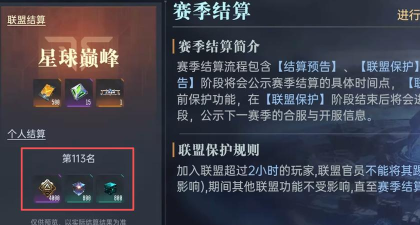 赛季结算机制也会直接影响到下一个赛季的补给份额,玩家在完成巅峰赛之后,会获取赛季的巅峰积分,游戏会根据玩家当前的巅峰赛排名,进行当前赛季的结算,结算分为三个阶段,它们分别是“结算预告”、“联盟保护”、“结算通告”,建议玩家在联盟保护之前,将自身的结算积分拔高,从而进一步增强下个赛季的赛季补给。