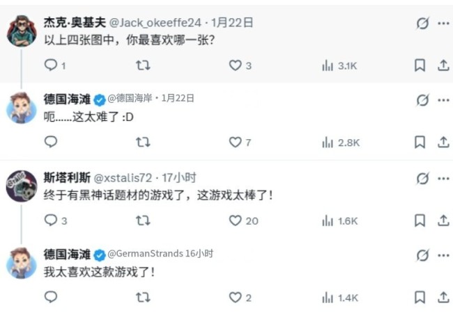 这些游戏在项目宣告之时便被玩家们所期待而游戏发售时更是带来超出预想的惊喜。用户询问GermanStrands那一款是它的最爱时,他表示很难评个高下。评论区也有玩家表示“终于有《黑神话:悟空》同好了,这款游戏棒的惊人”。