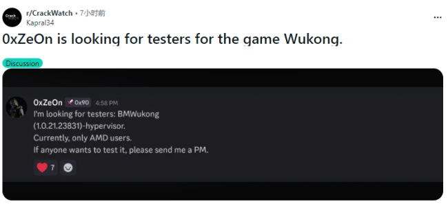 0xZe0n表示,他正在网上招募志愿者,测试《黑神话:悟空》D加密学习补丁,这也意味着这款国产大作的学习版或将很快出现。