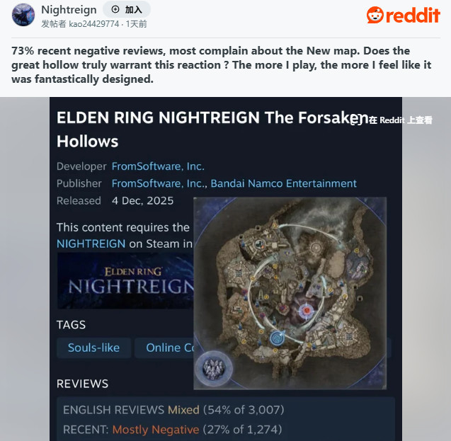 也有人抱怨地图上的Evergaols数量太少,尽管地图上仍然有掉落钥匙的宝箱。还有很多人像SergeantHungry9那样表示“我这辈子都会恨死这张破地图”。