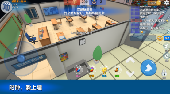 基于经典捉迷藏机制升级而来,支持5至20人同局竞技。系统自动分配追捕者与躲藏者阵营,躲藏方可在24张主题地图中自由选择场景——涵盖办公室、校园、航天基地、军事要塞等多元环境,并通过拟态系统伪装成对应场景内的静态物品。采用3D建模与联网同步技术,实现高自由度探索与实时对抗体验。