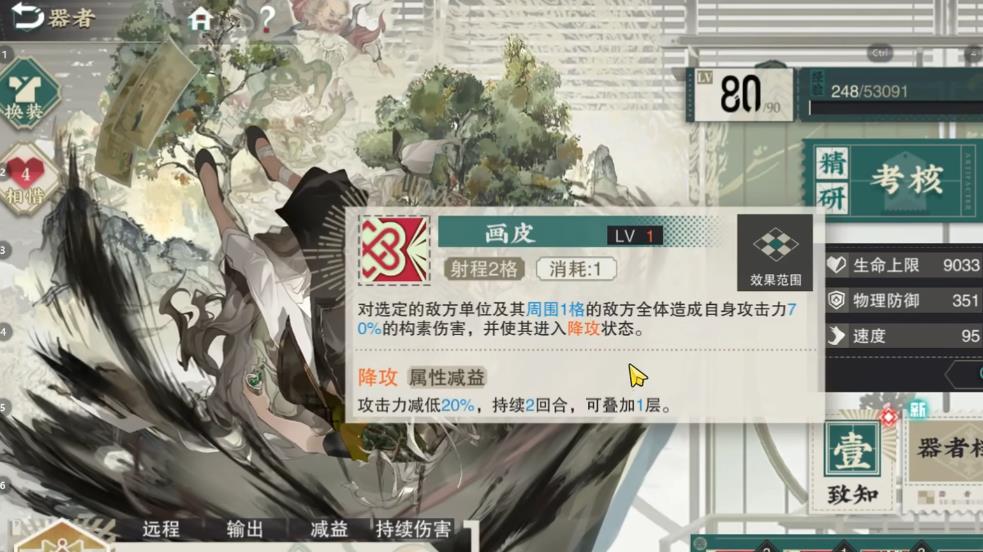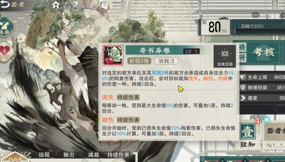 聊斋图说的职业技能名为画皮,为单体伤害,只有70%倍率,会让敌人进入到一层降攻状态,一般情况下用不到。绝技名为奇书异卷,具备有常规的构素群体输出范围,150%倍率,受击的敌方会被随机附加一层持续两回合的伤害。目前的持续伤害包含流失、融伤、灼烧等三种,其中融伤出现概率最高,而流失最低。被动一名为谈狐说鬼,效果是攻击会对目标施加一层持续两回合的暗影,让其受到的持伤提高15%。