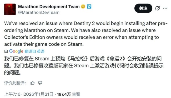 由于两款游戏在内容上并无直接关联,此次“强制捆绑”安装引发了玩家的困惑与调侃,甚至有人猜测这是Bungie为提升《命运2》玩家数量的策略。对此,《马拉松》开发团队通过官方社交媒体迅速澄清,证实这是一个技术故障,并表示已发布更新修复了该问题。此次更新还一并解决了典藏版玩家在Steam上激活代码时可能出现的错误。
