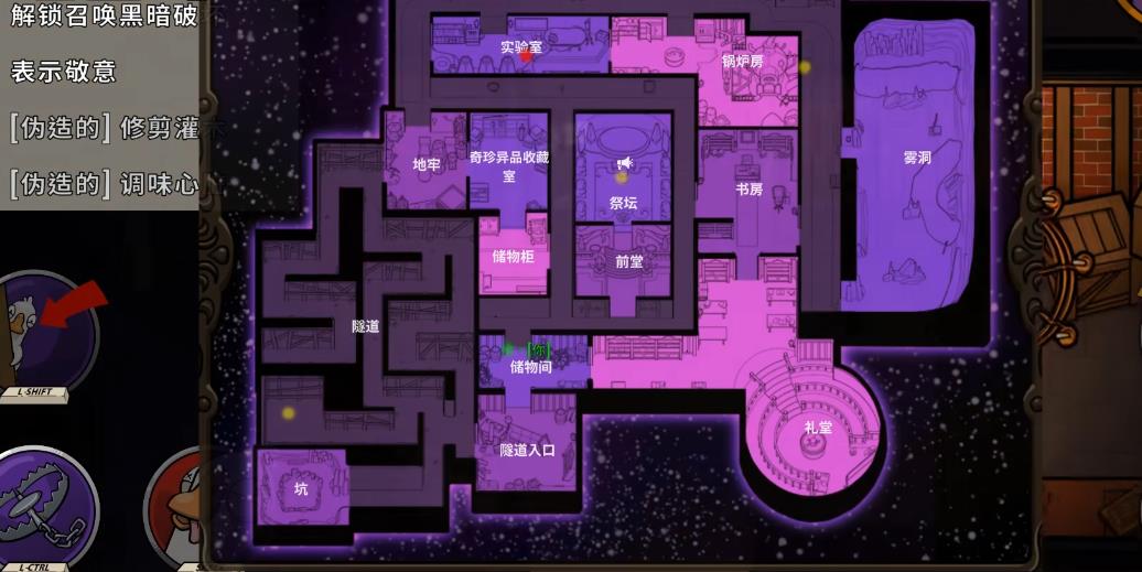 地下室里的破坏基本上都是鸭子按照白点的顺序点击连线即可完成,每局必刷的狼任务有关灯,其他四个任务都随机刷新两个。在雾洞里做任务后便能做雾洞破坏,开启后便能在地图上看到红圈,可以确定鹅的大致位置。在学习室里做完任务后就能触发古神破坏,对应的好人任务是盖手印,需要的时间比鸭子短很多。破坏冷却比摇铃冷却快一秒钟,利用好破坏可以给自己争取到出刀时间。