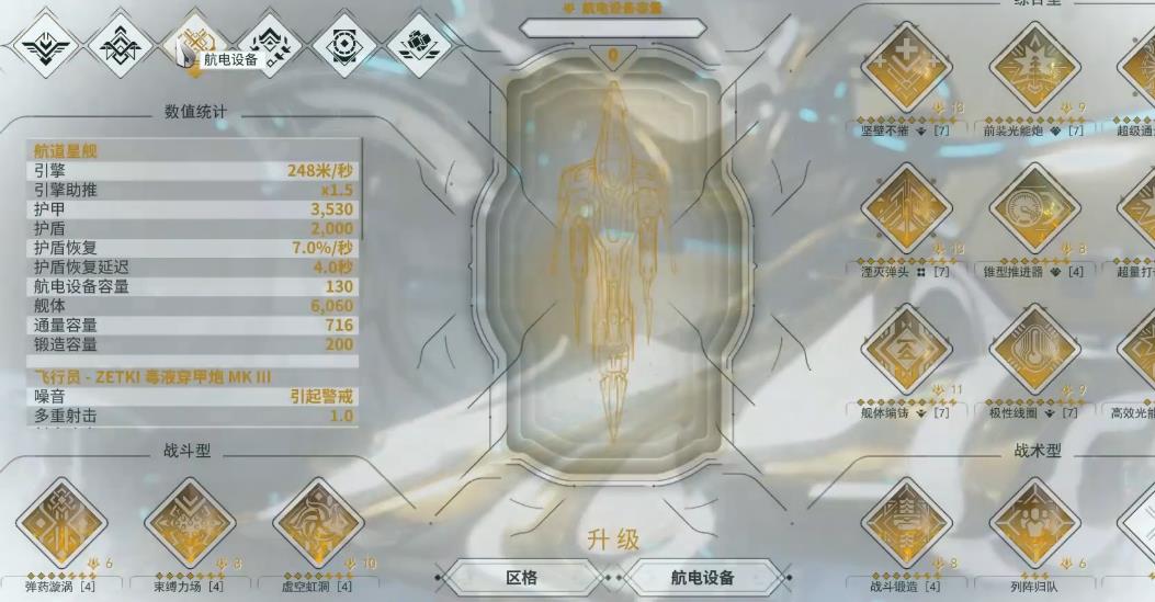 右下方与左下方的战斗型区域则是战舰的技能模组,左边的是用来进攻的输出技能,右边是提供战术支持的辅助技能。就像战甲一样使用技能会消耗能量值,而战舰的能量值名为通量能量。在左侧可预览到战舰的属性,中间上方的位置显示了其目前的模组容量,点击下方图标即可对模组与槽位升级,需要用到狄拉克核心。
