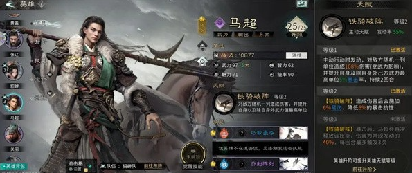 【铁骑破阵】:对敌方随机一列单位造成伤害,并提升自身及除自身外己方武力最高单位5%暴击率,持续2回合。