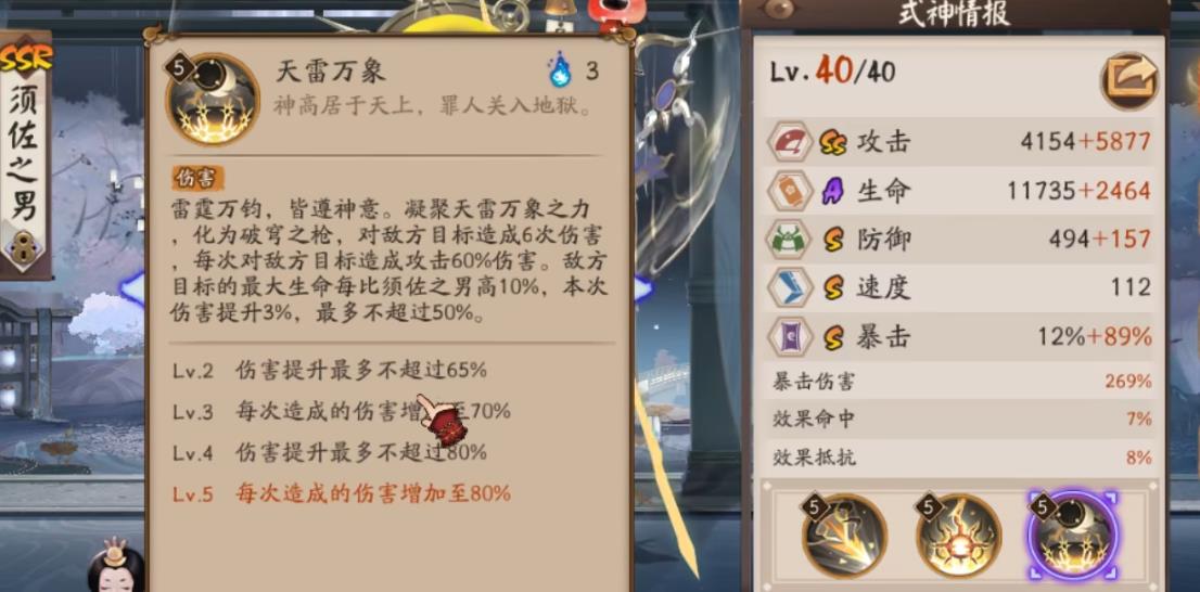 效果是当敌方血量须佐之男高便会获得对应的增伤,而当其血量高于我方四点四倍时即可达到最大增伤。该数据还是比较容易达到的,毕竟现在boss动不动就上百上千万的血。不过该增伤是有上限的,上限是80%,而将二技能升满后可以提升20%的上限,也就是100%的增伤效果,然而增伤的效果会被千姬和缘结神的增益效果稀释掉。