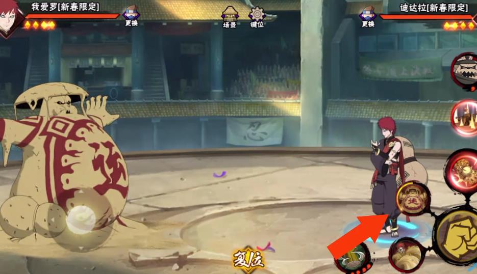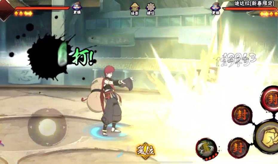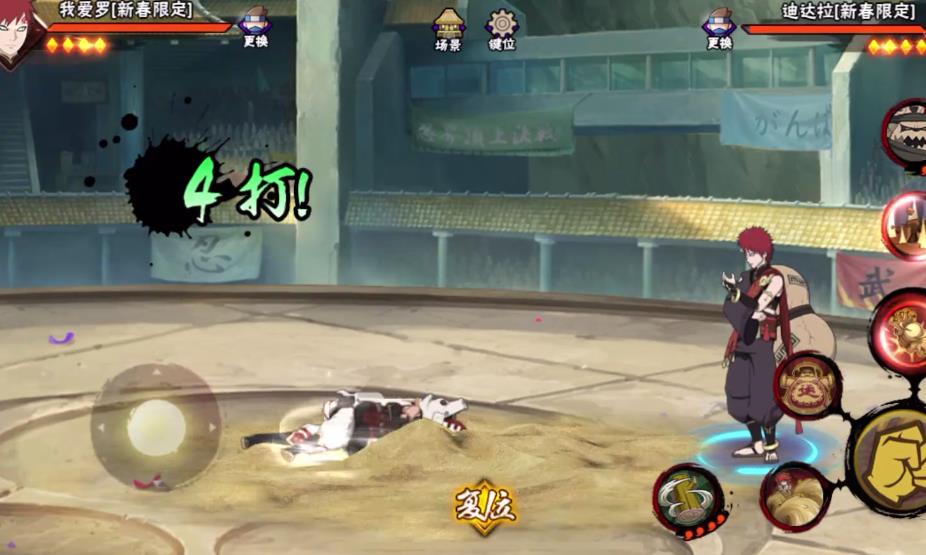 新春我爱罗是稀有度为A级的忍者,普攻共四段,主要是利用沙子来攻击敌方忍者。一段平推,二段将目标浮空并扫地,三段是控制沙子形成沙刺进行刺杀。四段是将目标包裹在沙球当中,有抓取与爆炸效果,还能利用摇杆移动沙球的位置。但只有当三段普攻攻击到目标后,才会触发后续四段的攻击,此时所有技能都会进入到后摇冷却封印中。当使用二段时将摇杆向后移动,则本体会随着沙子向后移动,可以利用方向键改变纵向轴的位置。