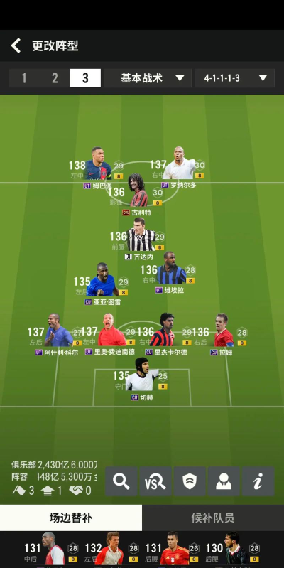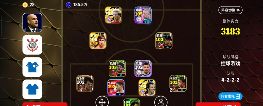 基于以上两点,前期的游戏节奏必然是以合卡为主,但合卡的随机性以及球员卡的快速变化,如果是用11人的纯血队套是很难上阵的,合出来的卡上不了阵就等于浪费战力,所以我这边给各位朋友一个前期百搭阵容,以8名90以下的球员卡+替补席凑出一个100化学的阵容,剩下三个主力位置可以上任意卡,来实现前期的战力最大化。
