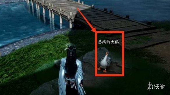 前往【神仙渡】地图西侧的红框标注位置,在桥边找到一只生病的大鹅。