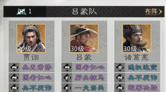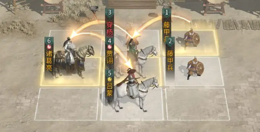 阵型部署需严格遵循追击格联动规则:吕蒙不占据追击格,诸葛亮置于其追击格内,确保每次追击动作均可高效触发。兵种配置方面,贾诩上方部署连弩军以强化远程爆发;前排左右两侧分别布设藤甲兵,凭借高物理减伤属性吸收大量伤害,稳固后排输出环境。技能搭配上,诸葛亮主带“通权答辩”(群体伤害+控制)、“运筹决胜”(增益+控场强化)与“兵不厌诈”(额外伤害+控制覆盖率提升),三者协同最大化控场持续性与伤害转化效率。