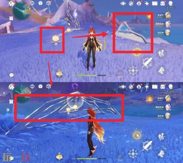 这里,先用地上的果实把附近的两个屏障打开,然后把果实放在适当的位置,让整体练成一个线,净化掉被深渊侵蚀的花,出现第二个月灵