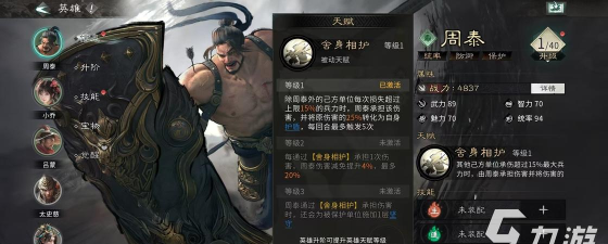 周泰的核心机制围绕“伤害分担”展开。其被动技能可为队友承担单次全额伤害,每回合最多触发3次,且触发条件为敌方目标当前兵力高于我方受击武将兵力的特定百分比阈值。这一机制使其成为脆皮主力(如太史慈、甘宁等高爆发输出)的理想守护者。当周泰处于前排时,不仅能有效延缓敌方关键技能释放节奏,还能显著提升我方核心输出的存活率与持续作战能力。