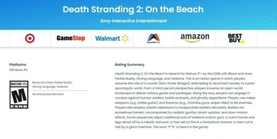 我们曾报道过,娱乐软件分级委员会(ESRB)曾一度删除《死亡搁浅2:冥滩之上》的PC版评级界面,让玩家们一度以为本作将无缘PC平台。如今,ESRB平台又重新发布了针对PC平台的评级,让粉丝们的悬着的心终于可以落地了。