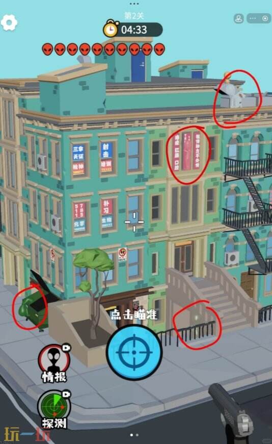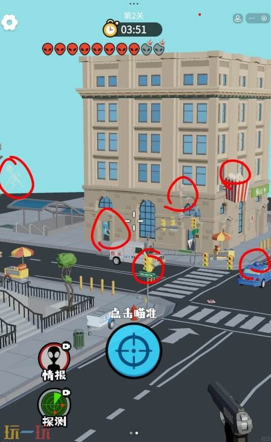 狙击外星人第2关需消灭10个外星人通关,游戏中的外星人可以像变色龙一样改变颜色,与周围的环境融为一体,只差一两个没找到可以使用游戏内的情报和探测获得信息,详细点位可对照下文查看。
