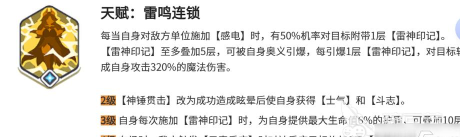 雷神的核心魅力就在于拥有雷神印记机制,而这一切全部都是和雷鸣连锁天赋有关。每一次雷神向敌方施加感电效果时,就有50%的概率会给目标增加一个雷神印记,最多可以叠加5层。一旦通过奥义引爆,那每一层印记全部都会给目标或者是周围敌人造成将近320%的魔法伤害。密集的范围性伤害就会瞬间瓦解敌方的阵型,随着天赋等级的提升,雷神的输出能力和生存能力都会有所提升。满级之后会额外增加8%的生命值,还有320点闪避。