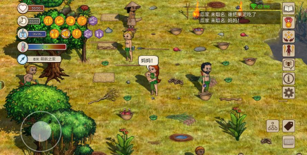 新手一定要注意好角色左上方的饥饿值,因为当该数值变成0,生命值就会下降,而当生命值变成0,大家就需要重生一世,变成新的身份才能进入到部落,部落中可供新手采集的果实有鸟巢里的食物、托马果树和奶葡灌木等,每一个村民值最大是100,通过吃果实和鸟蛋可以提升这个最大值;