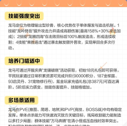 龙马是前期强力的输出宠物,基本上每个人都会拥有一支,初始5技能,修行满5阶后6恩格技能,宠物套装共鸣后7个技能,表现力是相当强的,不管是PVE还是PVP。