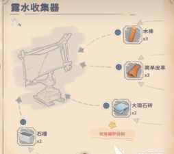 制作一台露水收集,器需要的东西包括木棒3根,简单皮革3张,大理石砖2块,还有石槽2个。这些材料里面,除了木棒相对好弄一点,其他几样都得花点心思准备。木棒的话用木头就能做,3根木棒总共需要9个木头,前期砍树应该能攒不少。