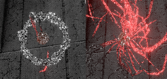 一个刚创建的球体(左)和即将消失的球体(右)