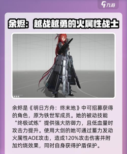 今天小编就带来明日方舟终末地余烬介绍。在明日方舟终末地这款游戏里面,余烬这个角色其实挺特别的。很多玩家刚开始看到她是火系干员,还以为她会像其他火系角色那样主打灼热伤害,结果上手之后发现完全不是那么回事。她的定位更偏向于保护队友,同时能提供不错的控制效果。如果你正在组建物理队伍,又觉得队伍生存能力不太够,那余烬可能就是你需要的那个角色。