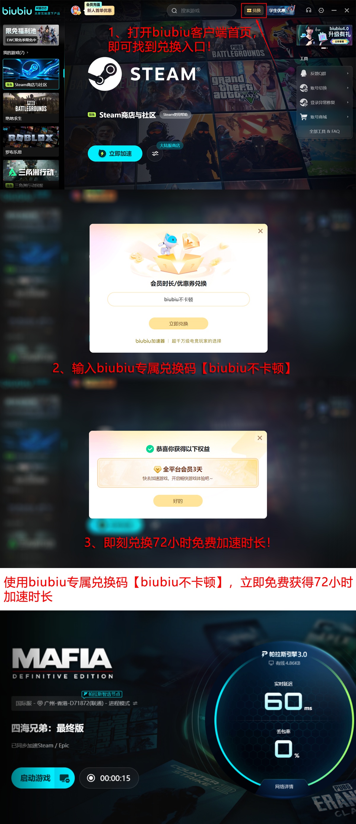 该工具支持全场景网络适配,尤其针对校园网、企业级NAT、多层代理等复杂网络拓扑设计了弱网对抗机制,能自动切换最优中继节点并动态调节MTU值。职业电竞选手Aixleft在公开直播中证实其在《绝地求生》高强度对抗环境下仍保持毫秒级延迟响应。新用户注册后可立即获得24小时全功能免费试用权限,覆盖《四海兄弟:最终版》《绝地求生》《Apex英雄》等主流PC及Switch平台游戏。输入专属兑换码【biubiu不卡顿】还可额外领取3天加速时长,首登用户累计享有最高96小时无限制体验周期,充分验证服务可靠性后再决定是否开通长期服务。